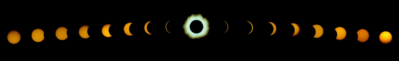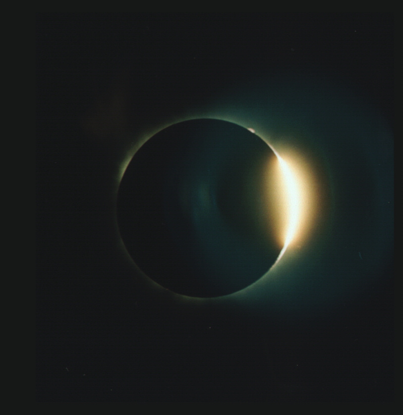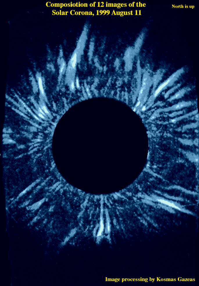 The last image of the Solar Corona (fil11_11.jpg) is a composition of 12 different images of the Totality, processed in Adobe Photoshop by the author. The method used to produce this image, is described in detail in the January 1998 issue of Sky&Telescope, page 117. In this image, one can see the fine structure of the Corona, with filaments of the Solar Wind emerging from the Solar surface.